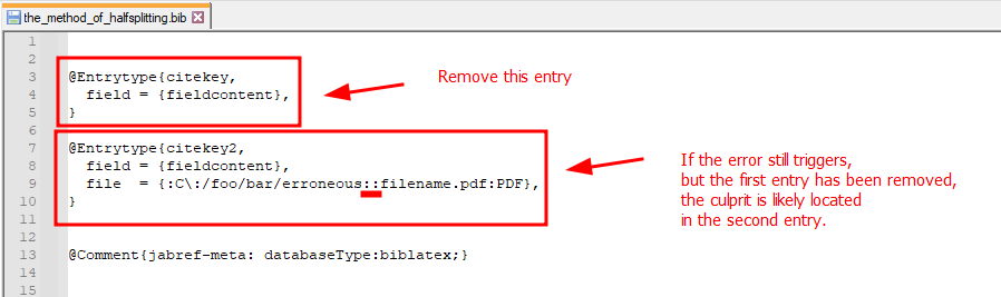 The method of **half splitting** (also referred to as **halving**) can be used to find certain faults in your library file, which are caused by erroneous syntax, file conversions or incompatible encodings/charsets. These faults may make it impossible for JabRef to correctly parse, read or import the library file.\
