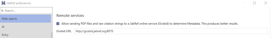 JabRef uses the technology offered by [Grobid](https://github.com/kermitt2/grobid), a machine learning software project with decades of experience and development dedicated to bibliographic metadata extraction. The Grobid parser usually tends to achieve better results than the rule-based parser. Since JabRef runs Grobid on a remote instance, users will have to confirm sending data to JabRef's online service in the preferences (*File > Preferences > Web search > Remote Services*). Sending data is disabled by default. It cannot be guaranteed that JabRef's Grobid instance will always be up and running, but it is possible for you to set up your [own Grobid Instance](https://grobid.readthedocs.io/en/latest/Grobid-docker/).
