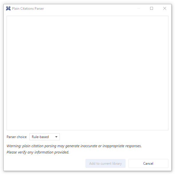 Different parsers will lead to different results. It is strongly recommended to fact-check all conversions, regardless of parser choice. All of them can confabulate. For comparison, [adding entries using an ID](https://docs.jabref.org/collect/add-entry-using-an-id) is much more reliable and accurate.