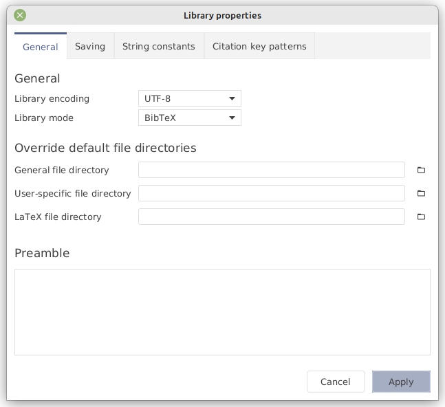 Each library can have specific properties that can be modified through Library→ Library properties. These specific properties override the generic properties defined in Options → Preferences.