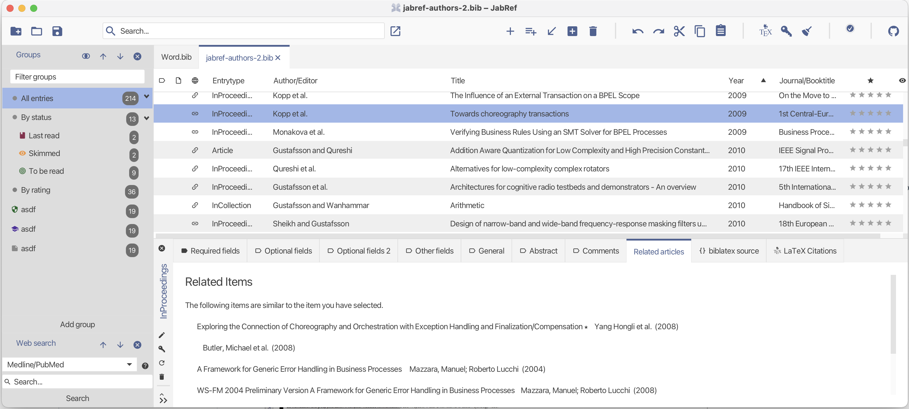 Mr. DLib is a service that calculates recommendations for you based on this title. After a short loading time the recommendations are listed in the Related Articles Tab. For detailed information see [Mr. DLibs help page](http://mr-dlib.org/information-for-users/information-about-mr-dlib-for-jabref-users/). The following image shows the Related Articles Tab with recommendations to the selected item.