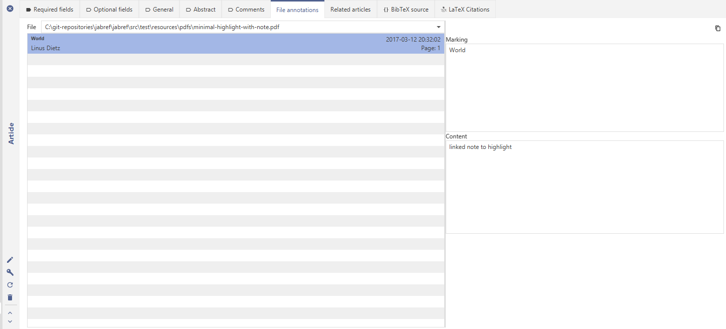 In the entry editor, you can now select the tab "File annotations" and you will see the content you have highlighted or commented on in the PDF.