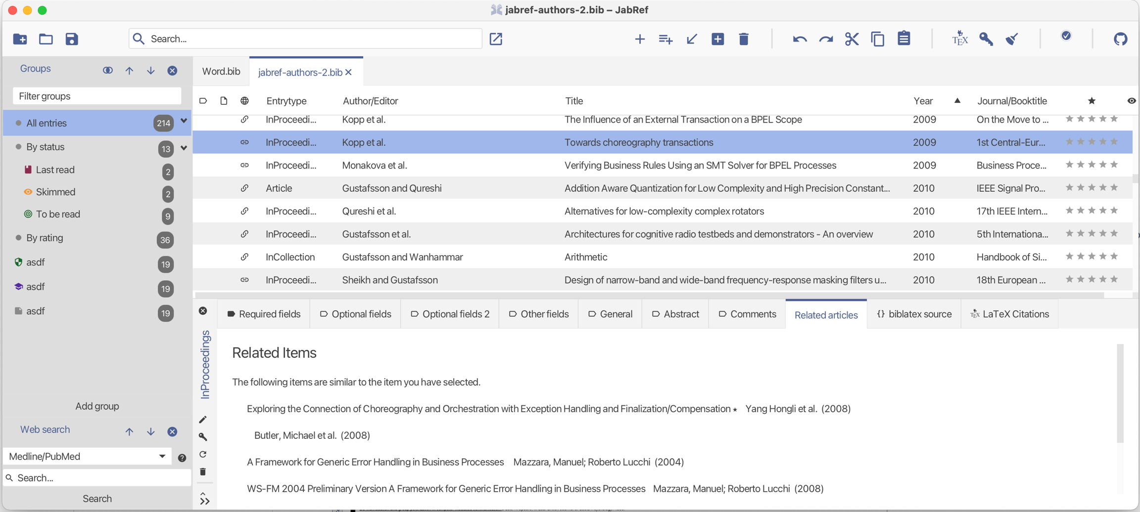 BibTeX source (termed biblatex source in case of a biblatex library) shows how th entry will appear when the database is saved in BibTeX (or biblatex) format. If you wish, you can edit the source directly in this panel. When you move to a different panel, press Ctrl + S or close the entry editor, JabRef will try to parse the contents of the source panel. If there are problems, you will be notified, and given the option to edit your entry further, or to revert to the former contents.