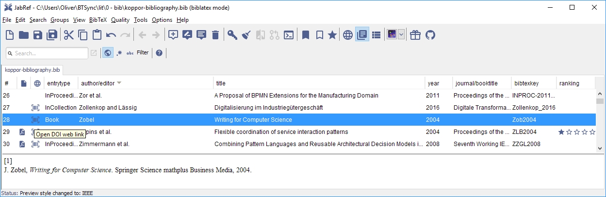 In the entry table you can select an entry and use the menu choice, keyboard shortcut or the right-click menu to open the file or web page. Finally, you can click on a URL or DOI icon.