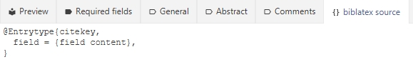 An entry consists of entrytype, citekey, fields and field content. The BibTeX and Biblatex standards define a wide range of entrytypes and fields, which should give much leeway. Users that have further needs will be able to edit their entries and come up with custom entrytypes, fields and citekeys, as long as the syntax is honored.