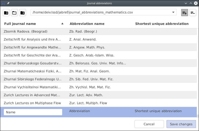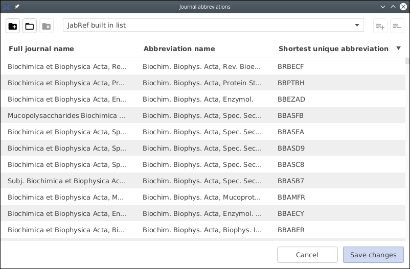JabRef includes a fairly extensive build-in list of journal abbreviations. This list is a merge of all lists available at https://abbrv.jabref.org. However, this might still be incomplete (or outdated) for the purposes of some users. Thus, JabRef allows to add abbreviations in the form of a personal list or external lists.
