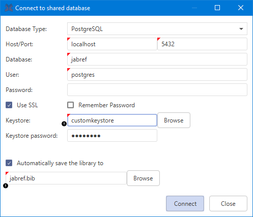 Since version 5.0 JabRef supports secure SSL connection to the database. For PostgreSQL make sure the server supports SSL and you have correctly setup the certificates. Then convert the client certificates into a java readable format and import them into a (custom) keystore. For MySQL the procedure is similar. Setting up MySQL with SSL and converting the certificates for the java keystore. However, it has only been tested with PostgreSQL. Once the certificates are imported into the keystore, specify the path to the keystore file in the connection dialog and the password for accessing the keystore.