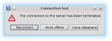 If you experience a problem with your connection to your shared database, the Connection lost dialog will show up. You can choose to Reconnect, Work offline or Close database. Most of the time simply reconnecting will fix this problem, if that's not the case you will have to choose between Work offline or Close database. Pick Work offline if you want to make sure your changes are saved. If you think there is nothing to save just pick Close database. If you choose to work offline, JabRef will convert the shared database to a local .bib database. Since you are no longer working online, but instead on a local database, you will have to import your work via copy and paste into the shared database. However before you import it into the shared database, make sure to check if changes happened during your offline time. Otherwise you might override someone else's work.