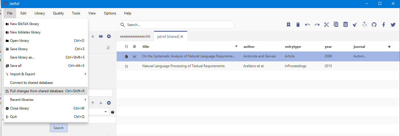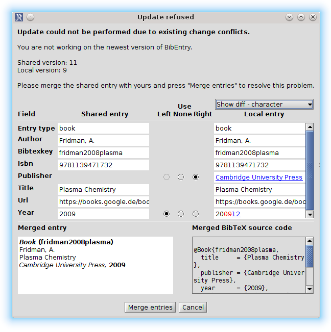 JabRef will automatically detect your changes and push them to the shared side. JabRef will also constantly check if there is a newer version available. If you experience connection issues, you can pull changes from your shared database via the icon in the icon bar. If a newer version is available, JabRef will try to automatically merge the new version and your local copy. If this fails, the Update refused dialog will show up. You will then have to manually merge using the Update refused dialog. The dialog helps you by pointing out the differences, you then will have to choose if you want to keep your local version or update to the shared version. Confirm your merge by clicking on Merge entries.
