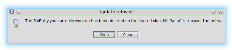 The Update refused dialog can also take a different form, if the BibEntry you currently work on has been deleted on the shared side. You can choose to keep the BibEntry in the database by clicking Keep or update to the shared side and click Close.