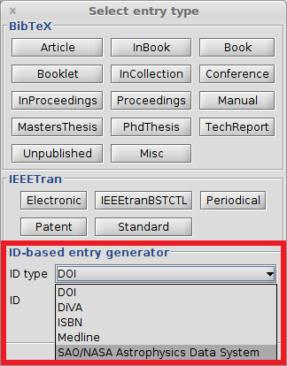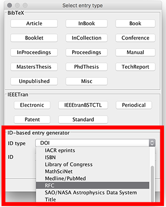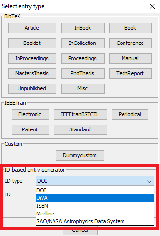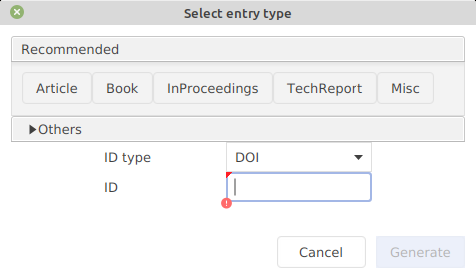 For other identifiers, choose Library → New entry, or click on the New entry button, or use the keyboard shortcut CTRL + N. In the lower part of the window, there are two boxes : "ID type" and "ID". In the field "ID type", you can select the desired identifier, e.g. "ISBN" (it works also for DOI). Then enter the identifier in the textbox below and press Enter. That will generate an entry based on the given ID (you can also click on "Generate"). The entry is added to your library and opened in the entry editor. In case an error occurs, a popup is shown.