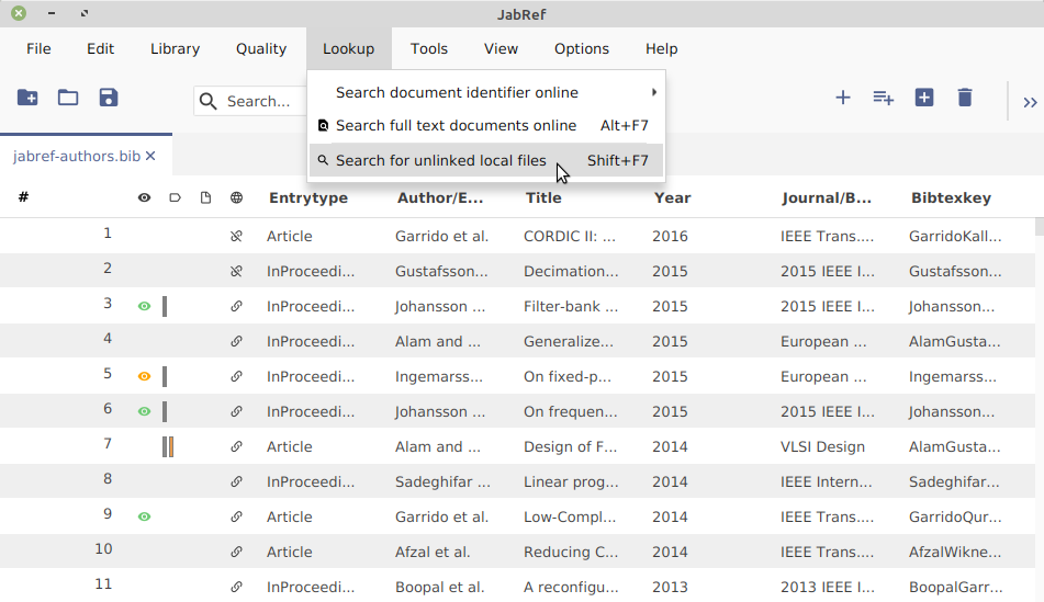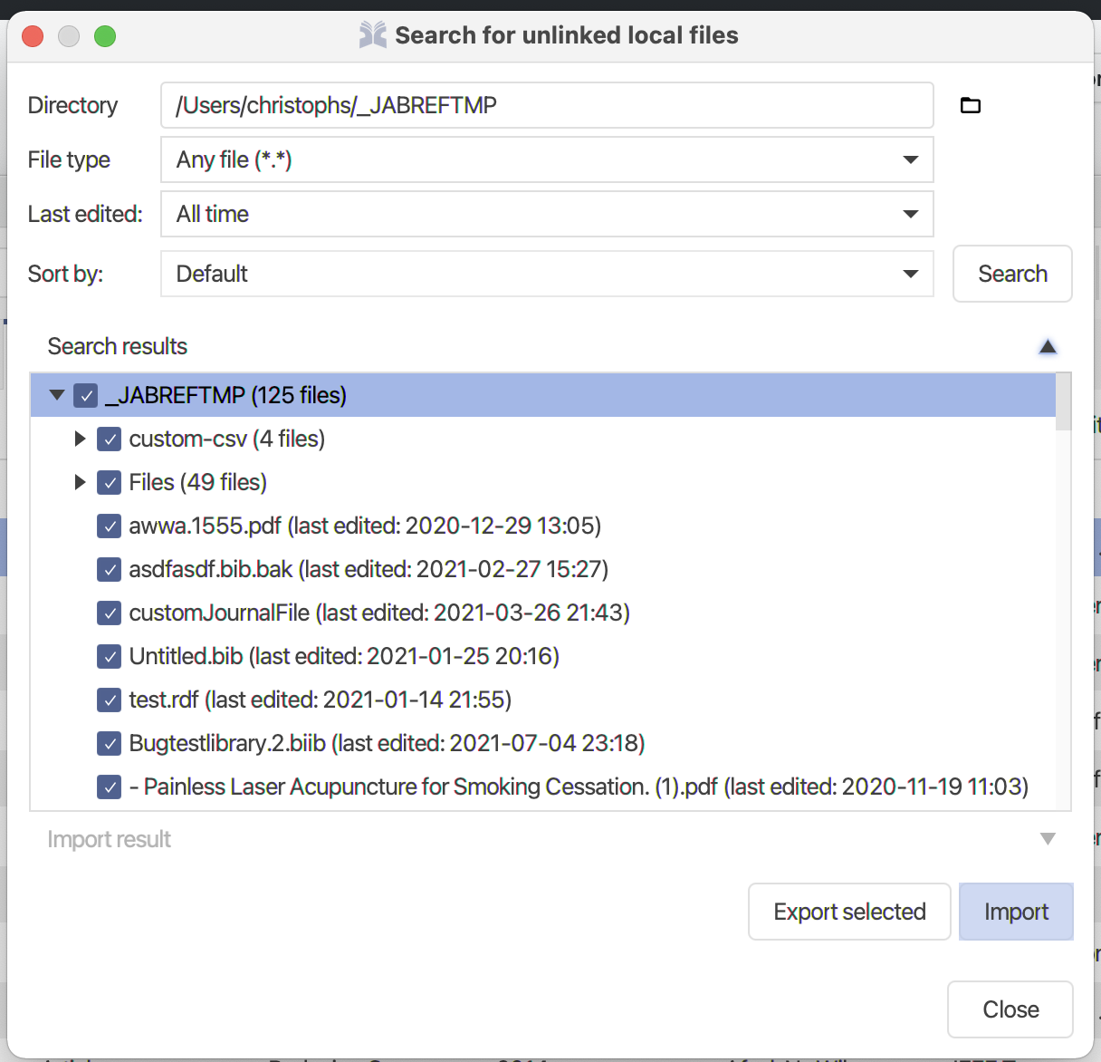 In case you have numerous PDF files and want to convert them into new entries, JabRef can search automatically for the PDF files, let you select the relevant ones, and convert them into new entries.