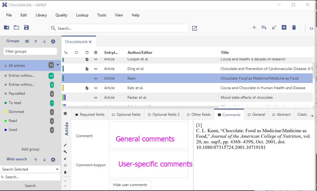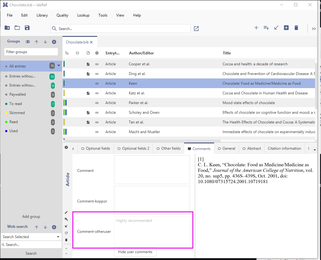Now, lets assume, the library (.bib File) is shared among different users. koppor closed the library and opened it later again. He sees that a user otheruser has written a comment: