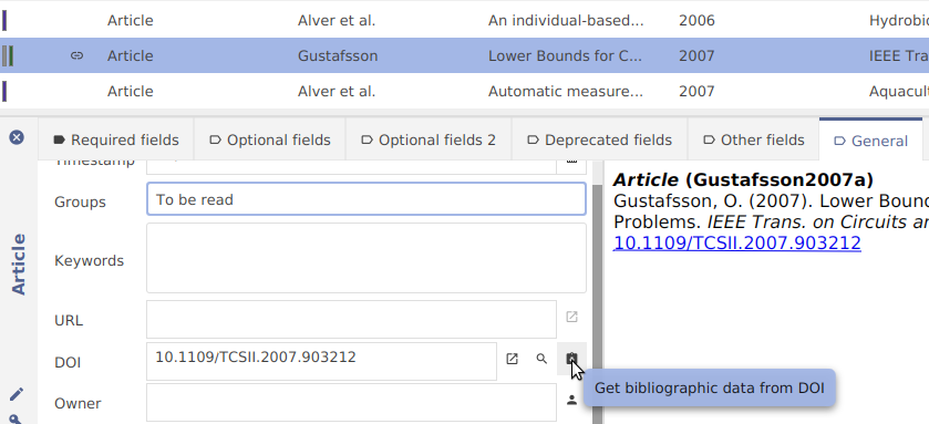 Option A) In the entry table, right-click on the entry to complement, and select the menu Get bibliographic data from DOI/ISBN/...
