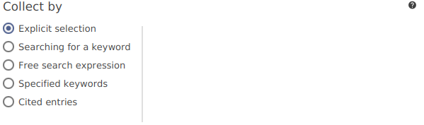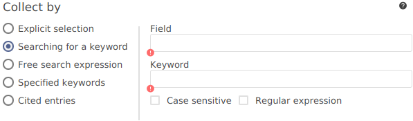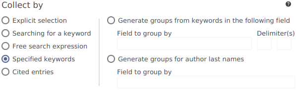 This method groups entries in which a specified field (e.g. author) contains a specified keyword (e.g. Smith). The mentioned example will group all entries referring to the author Smith.