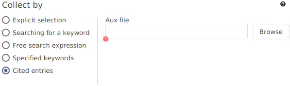 The group contains the entries cited in a LaTeX document, based on its '.aux' file. The .aux file has to be specified.