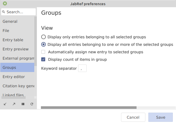 The content of the group is updated dynamically whenever the database changes: JabRef allows to manually assign/remove entries to/from the group by simply appending/removing the search term to/from the content of the grouping field. For example, if you add the keyword A to an entry, this entry will be added to the dedicated group automatically. This makes sense only for the keywords field or for self-defined fields, but obviously not for fields like author or year.