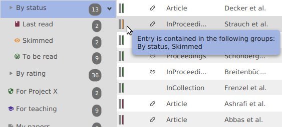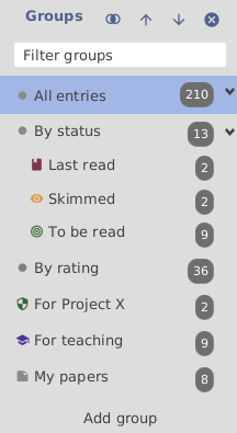 Groups allow structuring of bibliographic libraries in a tree-like way that is similar to organizing files on disk in directories and sub-directories. The two main differences are: