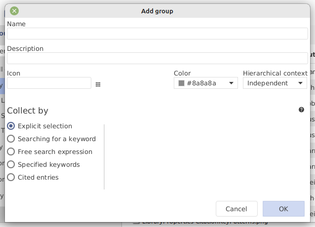 This method of grouping requires that all entries have a unique citation key. In case of missing or duplicate citation keys, the assignment of the affected entries cannot be correctly restored in future sessions.