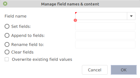 Set the field name (by typing it in or using the drop-down menu), and select the action to be carried out. Additionally, a checkbox allows overwriting the existing field values.