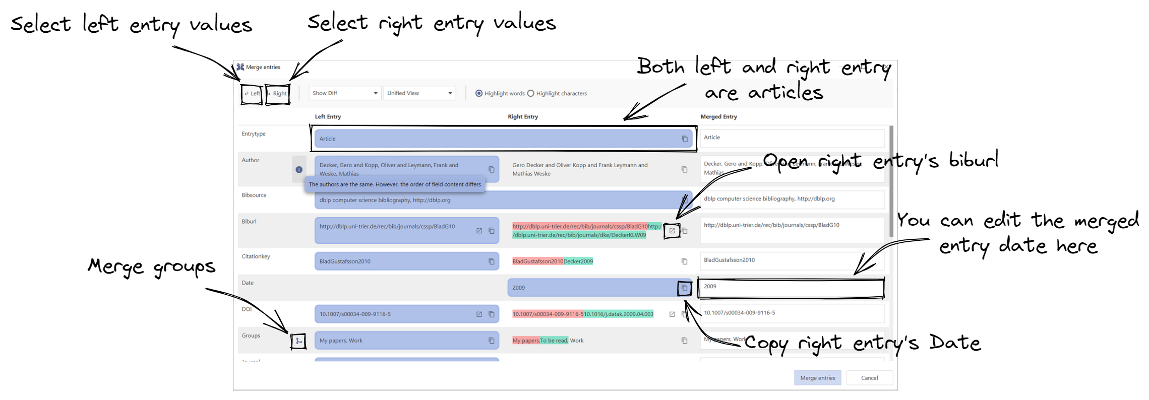 For each field, you can select whether to choose the left entry value or the right one. You can do that by clicking on the given field cell. Once you did that, the merged entry will update its content to reflect the new change.