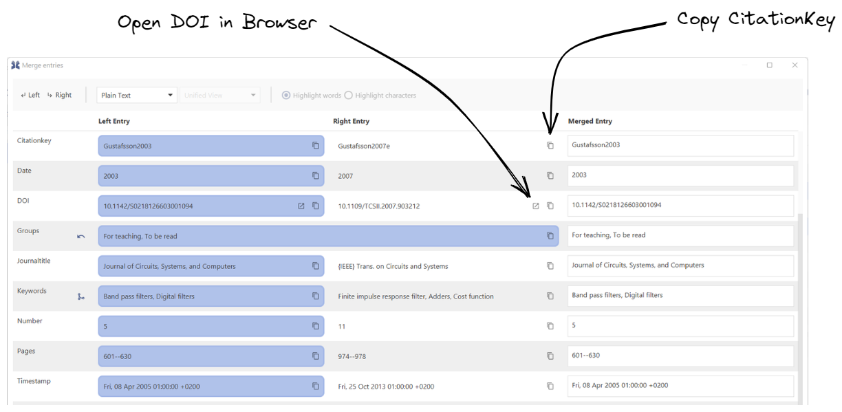 There are two buttons at the end of each field cell: one for copying the content of the field cell, and the other for opening links; at the moment, only URLs and DOIs can be opened.