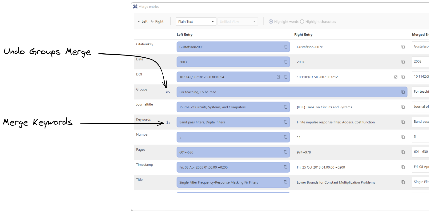 You can also edit the merged entry values manually. Doing so, will update the selected field cell if the left or right cell equals that value you typed.