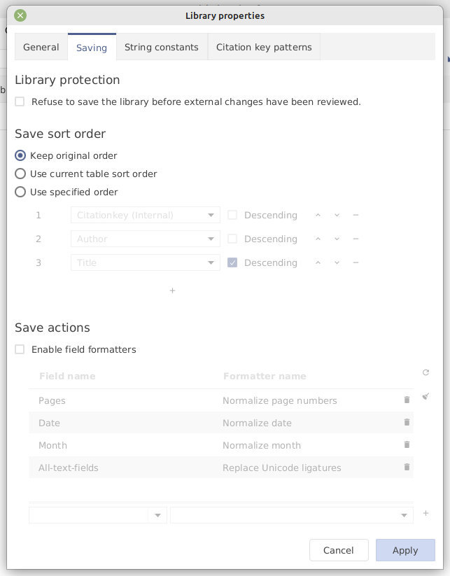 Field formatting can be tidied up when saving the library. That ensures your entries to have consistent formatting. If you check Enable save actions, the list of actions can be configured.